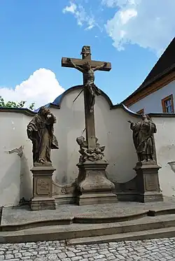 Die Figurengruppe aus Sandstein zeigt in ihrer Mitte den am Kreuz hängenden Jesus. Um ihn herum gruppieren sich Maria und Johannes. Alle drei Figuren stehen auf Sockeln. Der Sockel des Kreuzes ist mit zwei Totenköpfen und einer Schlange verziert. Zusammengehalten werden die drei Figuren durch wellenförmige Verbindungsstücke, die mit Blumen geschmückt sind.[3]