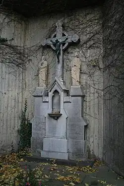 Die Kreuzigungsgruppe datiert gemäß Inschrift von 1910. Sie ist circa drei Meter hoch und aus Blaustein gefertigt. Die Gruppe steht auf einem breiten Unterbau mit einer Inschriftentafel. In der Mitte des Unterbaus befindet sich eine Nische mit dachförmigem Aufbau in neugotischen Formen. Rechts und links auf den Konsolen stehen Sandsteinfiguren, die Maria und Johannes darstellen. Weiterhin steht auf dem Unterbau in der Mitte ein großes Steinkreuz mit bronzenem Korpus. Zum Schutz vor der Witterung wurde die Kreuzigungsgruppe mit einer Betonmauer an drei Seiten umfriedet.