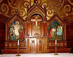 Der Altar zeigt verschiedene Darstellungen Christi: das Ereignis am Ölberg, die Grablegung und die Auferstehung Jesu Christi. Die Deckenmalerei stellt Christus mit einer Engelschar dar. In den Seitenschiffen sind bildliche Darstellungen zur Kreuzauffindung und zur Kreuzerhöhung zu sehen.[1]