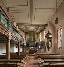 Die Orgel wurde von Philipp Heinrich Hasenmeyer zwischen 1747 und 1749 erbaut. Es ist das einzige erhaltene Instrument Hasenmeyers, von dem neben dem prächtigen Gehäuse und Holzpfeifenwerk noch die Manualwindlade und ein Teil der Trakturen überliefert sind. Bemerkenswert ist, wie die Orgel die Perspektivenwirkung des Deckengemäldes aufgreift: Die senkrechten Gehäuseteile sind nach innen geneigt, sodass mehr Höhe vorgetäuscht wird. 1994 wurde die Orgel durch die elsässische Werkstätte Rémy Mahler restauriert, die fehlenden Teile wurden stilsicher rekonstruiert. Das Schleifladen-Instrument hat 13 Register auf einem Manualwerk und Pedal. Die Trakturen sind mechanisch[1]