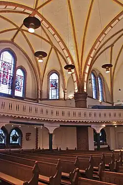 Der Innenraum hat durch das Vierungsgewölbe einen sehr starken Zentralcharakter erhalten, der durch eine umlaufende hölzerne Empore noch verstärkt wird.