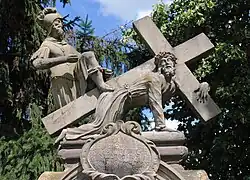 Auf einem profilierten Sockel findet sich darüber die eigentliche Besonderheit des Stocks. Eine Figurengruppe, die den stürzenden Christus mit dem Kreuz (Kreuzschlepper) und einen ihn tretenden Gerichtsknecht zeigt. Der Geschundene kniet und hat sich mit seiner rechten Hand abgestützt, während er mit der linken das übergroße Kreuz trägt. Dahinter findet sich ein stehender Knecht im Gewand des römischen Soldaten. Er tritt den Gestürzten mit seinem linken, nackten Fuß.[4]