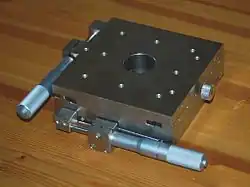 Auch Messsysteme können mit einem Kreuztisch ausgerüstet sein. So muss die Messanordnung für die Oberflächenprüfung optischer Bauelemente bei bestimmten optischen Testverfahren über einen großen Verfahrweg reproduzierbar im Mikrometerbereich eingestellt werden können.
