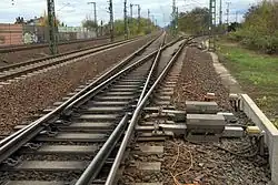 Oberleitungen müssen an nicht-spitzwinkligen Gleiskreuzungen besonders ausgeführt werden (→ Oberleitungen).