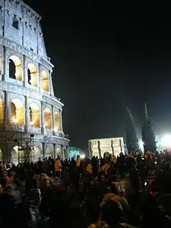 1964 griff Papst Paul VI. ein älteres Vorbild wieder auf. Seither findet jedes Jahr ein Kreuzweg am Kolosseum[16] in Rom mit dem Papst statt. Die Andachtsform des Kreuzwegs (siehe oben) kam in der ersten Hälfte des 17. Jahrhunderts aus Spanien nach Italien. Einer der stärksten Apostel des Kreuzwegs war der bereits erwähnte hl. Franziskaner Leonardo von Porto Maurizio († 1751) Er selbst errichtete mehr als 572 Viae Crucis, einschließlich der berühmten vierzehn Stationen im Kolosseum, mit denen Papst Benedikt XIV. ihn zum Abschluss des Hl. Jahres 1750 beauftragte. Benedikt XIV. hatte das Kolosseum 1750 zur Gedenkstätte für christliche Märtyrer der Antike erklärt.