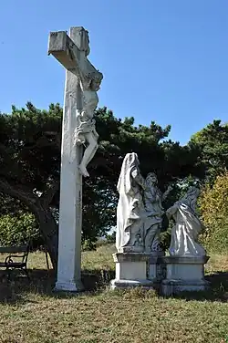Dabei wurde die barocke Kreuzigungsgruppe mit Assistenzfiguren aus dem ersten Viertel des 18. Jahrhunderts als 12. Station eingebunden. Die Figuren zeigen die Jahresangaben 17(17), 1725, 1830 und 1842.