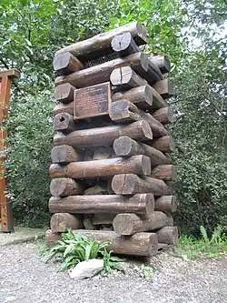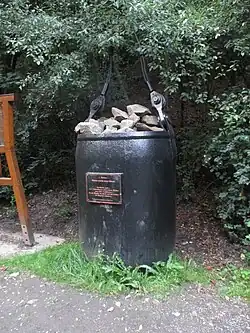 Ein mit Steinen gefüllter Teufkübel steht an der 1. Station des Kreuzweges. Im Bergbau nutzt man diese Gefäße um anfallendes Gestein beim Herstellen eines Schachtes (Teufen) zu heben.