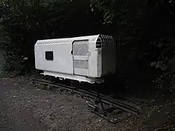Bei dem weißen Schienenfahrzeug handelt es sich um einen Fahrungswagen. In solchen Wagons fuhren die Bergleute mit der Grubenbahn zu ihren Arbeitsplatz Unter Tage ein.