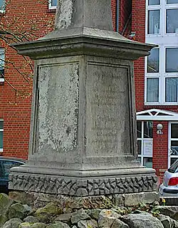 Der Sockel besteht aus einem „auf Spalt“ gestellten Block aus Wealdensandstein. Das heißt, die Gesteinsschichtung des Materials ist senkrecht zu der Lage im Steinbruch. Dies führt zu einer verstärkten Verwitterung des Sandsteins. Die Inschriften sind daher stark angegriffen.[4]