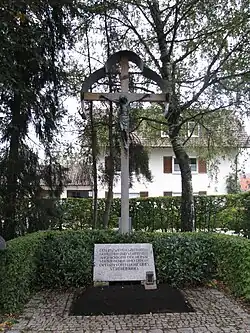 Gegenüber dem Denkmal befindet sich eine Gedenkstätte[4] mit einem Kruzifix, zu dessen Füßen auf einer Marmorplatte folgende Aufschrift steht: „Den im zweiten Weltkrieg gefallenen und vermissten Angehörigen der Heimat, Vertriebenen und den Opfern von Flucht und Vertreibung“.