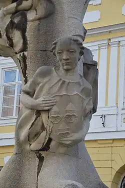 Die zuunterst aus dem Stamm wachsende Figur zeigt einen Jüngling, der mit ernstem und traurigem Blick einen Schild mit dem Wappen Landshuts in Händen hält. Entsprechend dem Text des Erinnerungsblatts von Wilhelm Lechner wendet sich die Figur an die junge Generation: