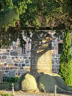 Das Kriegerdenkmal in Hämerten befindet sich an der Straße Am Meilenstein, ehemals Dorfstraße, auf dem Gelände der Kirche des Ortes.[1] Auf einem Sockel aus Feldsteinen befindet sich eine Gedenktafel in Form eines großen Grabsteines. Auf der einen Seite ist eine Inschrift und die Namen der Gefallenen des Ersten Weltkriegs eingemeißelt. Auf der anderen Seite wurde eine gravierte Granitplatte mit einer Inschrift und den Namen der Gefallenen des Zweiten Weltkriegs angebracht.[2]