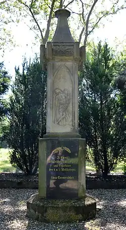 Das Denkmal wurde als steinerne, verzierte Stele auf einem runden Sockel gestaltet. Auf der Vorderseite befindet sich ein einen Engel darstellendes Relief. Unterhalb des Reliefs ist eine Gedenktafel mit der Inschrift: