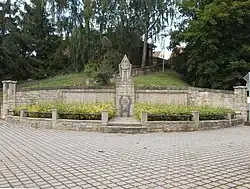 Eine zusätzliche Gedenktafel mit der Inschrift Zum ehrenden Gedenken an die Opfer des 2. Weltkrieges für die Gefallenen des Zweiten Weltkriegs wurde später hinzugefügt. Das Denkmal ist durch einen halbrunden Zaun von vorne eingegrenzt und wurde in einen kleinen Hang hineingesetzt.