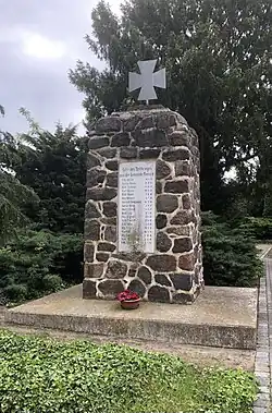 Das Denkmal ist als aus Feldsteinen errichteter, aufrecht stehender Quader gestaltet. Der Quader steht auf einem sehr flachen Sockel. In seiner zur Straße hin ausgerichteten Westseite ist eine Tafel mit den 18 Namen der Gefallenen eingelassen. Auf der Spitze befindet sich ein Eisernes Kreuz.