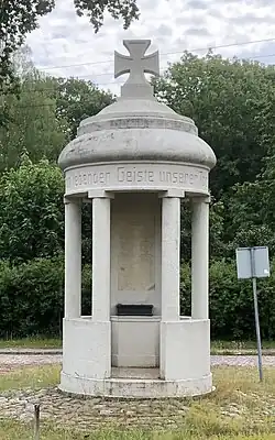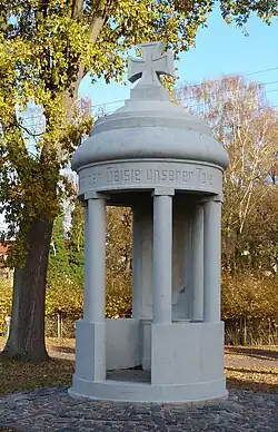 Die Gestaltung des 1924 im Auftrag des örtlichen Militärvereins von A. Gnorke aus Rathenow errichteten markanten Denkmals erinnert an einen römischen Rundtempel. Von vier Säulen wird eine Kuppel getragen, die von einem steinernen Eisernen Kreuz bekrönt wird.