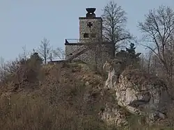 Der Rest des Bergfrieds der Burg Rosenberg wurde in den Sockel des Kriegerdenkmals eingebaut. Es handelt sich um ein gestuftes, turmartiges Bauwerk aus bossiertem Dolomitmauerwerk. Es besteht aus zwei Teilen: einem großen Block von 10,5 m Seitenlänge und 7 m Höhe sowie einem kleineren Block mit 5 m Breite und 9 m Höhe. Dieser trägt auf jeder Seite zwei eherne Tafeln mit den Namen der 114 im Ersten Weltkrieg gefallenen Rosenberger Soldaten, darüber ist das Deutsche Kreuz angebracht. Gekrönt wird das Bauwerk von einer 6 t schweren gusseisernen Opferschale.