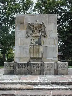 Auf der Vorderseite zeigt das Monument einen Adler, der seine Schwingen über einem Nest mit Adlerküken ausbreitet. Darunter befinden sich zwei steinerne Gedenktafeln mit den Namen der Toten des Ersten Weltkrieges. Für die Jahre 1914–1919 (sic!) sind die Namen der Gefallenen des jeweiligen Jahres angegeben. 1989 wurde Gustav Levy nachgetragen. Unterhalb der Gedenktafeln befinden sich fünf Vorsprünge. Von links nach rechts tragen diese Vorsprünge die Jahreszahlen der Kriegsjahre 1914–1918.
