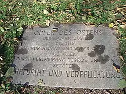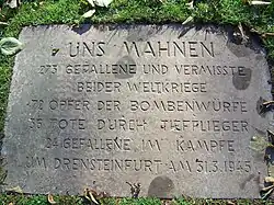 Das Steinmonument wird U-förmig von einem Blumenbeet umgeben, in dem Steine mit den Namen der Toten der Bombenangriffe vom 23. März 1944 und 26. März 1945 liegen. Eine Gedenkplatte erinnert an die Toten: