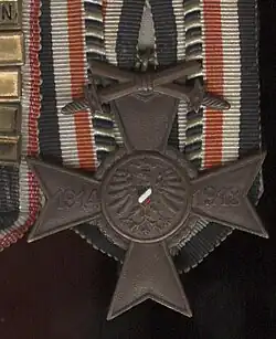 Im Zentrum der kaiserliche Reichsadler mit Krone, dessen Mittelschild diagonal schwarz/weiß/rot emailliert ist. Das Zentrum ist von einem schmalen Eichenlaubkranz eingefasst. Auf den beiden waagerechten Kreuzarmen die Jahreszahlen (links) 1914; (rechts) 1918. Bei den Kämpferkreuzen sind oben, unterhalb des Trageringes, zwei gekreuzte Schwerter aufgesetzt.