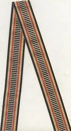 Getragen wurde die Auszeichnung auf der linken Brust, an einem Band, das rechts und links als einfassende Kante, die in Trikolorenform nebeneinanderliegenden Nationalfarben schwarz/weiß/rot zeigt. Mittig dazwischen, ein in den preußischen Farben schwarz/weiß geleiterter Streifen.