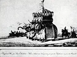 „Der Kaiser Kublai Khan in einem von vier Elefanten getragenen Turm am Tag der Schlacht“ Französischer Kupferstich aus dem 18. Jahrhundert.