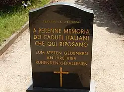 Erst im November 1917 kamen die italienischen Kriegsgefangenen in einem äußerst schlechten gesundheitlichen Zustand nach Königsbrück. Folglich verstarben 182 von den über dreitausend gefangenen Italienern. Der Gedenkstein für die italienischen Kriegsgefangenen war der letzte auf dem Gefangenenfriedhof in Königsbrück. Der aus Granit bestehende Gedenkstein ist 3 Meter hoch und hat eine Grundfläche von 1,9 × 1,9 Meter. Auf einer Marmorplatte lautet die Inschrift: Die Italiener - Ihren Brüdern - 1917-1918. Die Inschrift wurde 1959 abgeändert.[2]