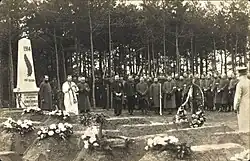 Nach dem 1. September 1914 verstarb der erste französische Kriegsgefangene, ein Marius Baronnier, und wurde auf dem städtischen Friedhof in Königsbrück beigesetzt. Doch schon wenige Tage später erlagen weitere französische Kriegsgefangene ihren schweren Verwundungen und Verletzungen. Auch diese wurden noch auf dem städtischen Friedhof beerdigt. Dabei war ein französischer Geistlicher, dieser hielt eine kleine Andacht mit einem Gedenken an alle Opfer des militärischen Konfliktes. Schon allein bis zum 12. September 1914 verstarben in dem Gefangenenlager im Alten Lager und im Reservelazarett II ein russischer und 25 französische Kriegsgefangene, welche noch auf dem städtischen Friedhof ihre Ruhe fanden. Damit war die Aufnahmefähigkeit des Friedhofes erreicht. Der Kommandant des Truppenübungsplatzes, Generalmajor Stark, richtete eine Anfrage an die Königliche Amtshauptmannschaft Kamenz, einen neuen Ort für die Begräbnisstätte festzulegen. Dazu schlug er den kleinen Kiefernwald, noch auf militärischen Gelände liegend, zwischen der Schmorkauer Straße und dem Zietscher Weg an der Nordostseite des Neuen Lagers vor. Bereits vier Tage später stimmte der Königliche Bezirksamtsarzt in Bautzen zu und genehmigte das Vorhaben. Am 18. September 1914 fand die Weihe mit einer Andachtsrede vom Königsbrücker Pfarrer Wauer, welcher zugleich auch die Garnison geistlich betreute, statt. Der circa 40 mal 50 Meter große Begräbnisplatz war von einem Drahtzaun umgeben und hatte mittig ein schlichtes Holzkreuz. Eingangsseits auf der linken Seite beerdigte man die Franzosen, auf der rechten wurde die Russen bestattet. Unter den Gefangenen waren einige orthodoxe Seelsorger und katholische Geistliche. Die evangelischen Gefangenen wurden von Pfarrer Wauer und Pastor Skierl aus Königsbrück betreut. Für die Katholischgläubigen war der deutsche Kaplan Rolewski, welche die Bestattungszeremonien übernahmen, zuständig.[2]