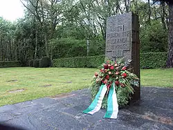 Auf dem Gedenkstein der Ehrenanlage steht geschrieben, dass die Lagertoten „Opfer von Hunger, Krankheit und Gewalt“ wurden: „Ihre Leiden mahnen zum Frieden.“[2]
