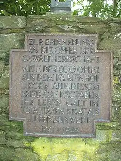 Im Jahr 1987 wurde an einer Mauer der Kriegsgräberstätte eine Gedenktafel für die Opfer der nationalsozialistischen Euthanasie-Morde des Kalmenhofes angebracht.