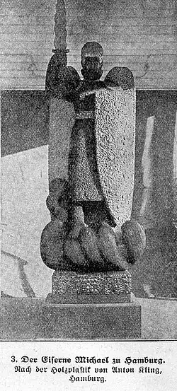 Der Wehrmann in Eisen, Holzfigur von 1914, war 8. März 1915 bis September 1916 als erste Kriegsnagelung am Schwarzenbergplatz in Verwendung. Er wurde 1934 am Amtshaus Felderstraße wieder aufgestellt.