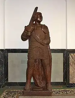 Aachen: Eine von Carl Burger entworfene Rolands-Figur in der Rotunde des Elisenbrunnens, erste Nagelung am 26. September 1915
