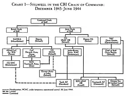 US-amerikanische und chinesische Streitkräfte, die im südostasiatischen Kampfraum dienten und als Northern Combat Area Command (NCAC) unter dem Kommando von Stilwell organisiert waren, antworteten direkt dem Obersten Befehlshaber, weil Stilwell sich weigerte, sich dem Befehlshaber der 11th Army Group, General George Giffard, zu unterstellen.[8]