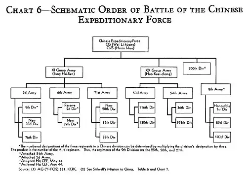 - Chinese Expeditionary Force (Y-Force) (General Wei Lihuang, ab 2. April 1942 General LuoZhuoying[19] gemeinsam mit Joseph Stilwell)