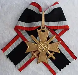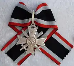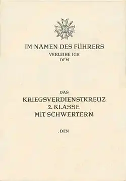 Das Kriegsverdienstkreuz, kurz KVK, war eine Auszeichnung des Deutschen Reichs im Zweiten Weltkrieg für Soldaten und Zivilisten und wurde durch Verordnung vom 18. Oktober 1939 im Namen Adolf Hitlers als Staatsoberhaupt gestiftet.[1] Es war die höchste Kriegsauszeichnung für Zivilisten, die nicht an Kriegshandlungen beteiligt waren. Es wurde auch an Soldaten verliehen, die sich bei sogenannten „sonstigen Kriegsaufgaben“, also keinen Kämpfen, beteiligten (z. B. Angehörige der Sanitätstruppe, Sanitätsoffiziere, Veterinäre usw.); speziell in diesem Zusammenhang galt das KVK umgangssprachlich als typischer, ohne Lebensgefahr zu erwerbender „Etappenorden“[2] für sogenannte „Etappenhelden“ oder „Etappenhengste“. Auch Mitarbeiter des Sicherheitsdienstes des Reichsführers SS (SD) und der Polizei erhielten diese Auszeichnung. Außerdem wurden Mitarbeiter der mit Kunstraub beauftragten Behörde Einsatzstab Reichsleiter Rosenberg (ERR) mit dem KVK ausgezeichnet. Im Falle von SD-Mitarbeitern deutet nach dem Historiker Carsten Schreiber die Verleihung des Kriegsverdienstkreuzes mit Schwertern auf eine Teilnahme an Gewaltaktionen hin,[3] womit beispielsweise die Teilnahme an Mordaktionen vorwiegend gegen die jüdische Bevölkerung in den eroberten Ostgebieten gemeint ist.