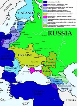 Die Zusatzverträge zum Brest-Litowsker Frieden vom 27. August 1918 stellten zwar einen neuen Höhepunkt der Demütigung Russlands dar, setzten aber gleichzeitig diesen noch viel weitergehenden Annexionsplänen ein vorläufiges Ende.[43] Die russischen Randstaaten von Finnland über die Ukraine bis nach Georgien waren zwar nicht direkt annektiert worden, befanden sich aber in enger wirtschaftlicher und militärischer Abhängigkeit vom Deutschen Reich.