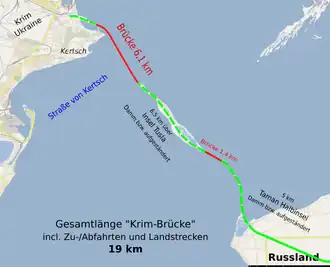 Die einschließlich der Zufahrten an Land rund 19 km lange Krim-Brücke überquert die Straße von Kertsch (6 km), die Insel Tusla (6 km), einen Flachwasserbereich (1,3 km) und die Nehrung der Halbinsel Taman (5,7 km). Sie besteht aus einem Brückenbauwerk für eine vierspurige Autobahn und südlich davon einem gesonderten Bauwerk für die parallel dazu verlaufende zweigleisige Eisenbahnstrecke. Damit gilt dieses Objekt als größte von Russland erbaute Brücke. Der Schifffahrtskanal wird von je einer 227 m langen Stabbogenbrücke mit einer lichten Höhe von 35 m überquert,[6] deren Pfeiler von großen Schiffsabweisern geschützt werden.