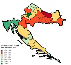 Die Wirtschaft Kroatiens wird stark vom Tourismus bestimmt,[9] so dass 2019 die Einnahmen daraus 19,2 % des Bruttoinlandsprodukts ausmachten.[10] Kroatien ist Mitglied der Vereinten Nationen, der Europäischen Union, der NATO, der OSZE und der Welthandelsorganisation. Seit 2023 gehört Kroatien zum Schengen-Raum und zur Eurozone.