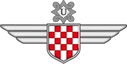 Das Abzeichen der „Kroatischen Luftwaffen-Legion“ (Znak Hrvatske zrakoplovne legije) zeigte das Staatswappen des Unabhängigen Staates Kroatien mit, horizontal zu beiden Seiten ausgestreckten, dreifederigen Schwingen. Tragerecht hatten alle Angehörigen der Luftwaffen-Legion (Kroaten und Ausländer). Getragen wurde es entweder in Metall oder als farbig bestickte Stoffausführung. Das Metallabzeichen wurde auf der rechten Brusttasche der Feldbluse getragen; befestigt mit einer horizontalen Fibel. Das Stoffabzeichen wurde am linken Oberarm der Feldbluse getragen. Hersteller waren die Firmen Braća Knaus und Me-Ba in Zagreb sowie die Firma Juncker in Berlin.[4]
