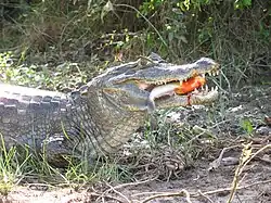 Krokodilkaiman (Caiman crocodilus) mit einem erbeuteten Piranha.