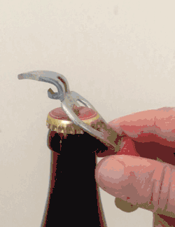Es gibt einen Bieröffner aus verchromtem Blech, dessen Hebelgriff ausreichend groß und plan ausgebildet sowie mit einer etwa 3 mm dicken Gummidichtung ausgelegt ist. An den konisch zulaufenden Längsseiten ist das Blech um 90° und etwa 75° eingefalzt, sodass diese Blechleisten unter den Wulst des Flaschenhalses, der sonst die Kronkorkenzacken hält, eingreifen und den Gummi dichtend anpressen kann, wenn der Öffner fest genug von einer Seite her aufgeschoben wird.