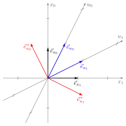 Bei nicht orthogonalen Koordinatensystemen (schiefwinklig) erhält man durch die Projektion eines Vektors auf einen kovarianten Basisvektor die kovariante Komponente (kovariante Komponente – in der Tensoranalysis mit tiefgestelltem Index geschrieben ) und nicht die kontravariante Komponente , da hier die Relation nicht gilt, bzw. der metrische Tensor nicht diagonal ist. Hierzu benötigt man das Konzept des Dualraums und der dualen Basis.