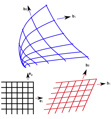 wobei die und konstant sind. Die Jacobi-Matrix entspricht dabei der Transformationsmatrix . Somit entsprechen die natürlichen Einheitsvektoren der -ten Spalte der Matrix .
