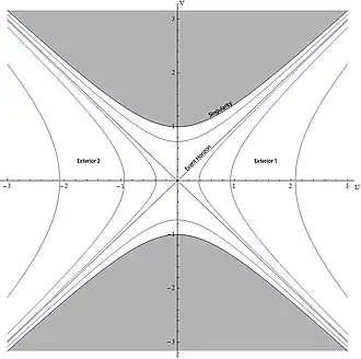 In den folgenden Formeln wird vereinfachend für die Gravitationskonstante und die Lichtgeschwindigkeit jeweils der Wert angesetzt; sei die Masse des Zentralkörpers. Das Linienelement der Schwarzschild-Metrik in Kruskal-Szekeres-Koordinaten lautet dann: