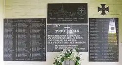 - Gedenktafeln im Turm der St.-Bonifatius-Kirche in Hessisch Oldendorf (Niedersachsen) erinnern an die 140 Opfer des Zweiten Weltkriegs und der anschließenden Flucht und Vertreibung aus Knispel