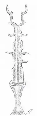 Das Kuba-Messer hat eine gerade, abwechselnd schmaler und wieder breiter werdende Klinge (siehe Bild Infobox). Auf beiden Seiten der Klinge sind hakenförmige Dornen ausgeschmiedet. Am Ort ist die Klinge geteilt und läuft in zwei Spitzen aus. Die Klingen haben meist einen starken, durchgehenden Mittelgrat. Dieses Messer wird von der Ethnie der Kuba benutzt.[1]