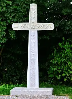 Dieses Kreuz wurde 1990 am Schützenhaus aufgestellt. Gleichzeitig fertigte Steinmetz Marx aus Euskirchen eine Kopie in Sandstein, die seit 2015 am nördlichen Beginn des Feldgehölzes steht.[14]