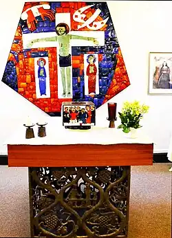 Das Turmuntergeschoss, wo sich eine Gedenktafel für die an diesem Ort getauften Widerstandskämpfer gegen den Nationalsozialismus, Willi Graf und Heinrich Ruster, befindet, ist seit 1972 endgültig als „Taufkapelle“ eingerichtet worden. In dem von Konrad Schaefer gestalteten Fenster ist das „Taufgeheimnis“ thematisiert. Dieser Künstler, als Heraldiker im Rheinland recht bekannt, hat auch das Wappen von Kuchenheim entworfen.[18]