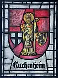 Das Wappen der Gemeinde Kuchenheim (Entwurf für eine Bleiverglasung von Konrad Schaefer) erinnert mit dem schwarzen Balkenkreuz an die Landesherrschaft vom Kurfürstentum Köln und mit dem schwarzen Löwen an die Landesherrschaft vom Herzogtum Jülich; die Figur des hl. Nikolaus verweist auf das Patronat der Pfarrkirche.