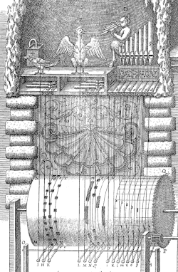 Wie der Kuckucksruf mit zwei Pfeifen mechanisch nachgeahmt werden konnte, hatte der Mechaniker Salomon de Caus schon 1615 beschrieben.[2] Offensichtlich orientierte sich Athanasius Kircher in dem weit verbreiteten Handbuch zur Musik Musurgia Universalis fünfunddreißig Jahre später an de Caus (1650), als er eine mechanische Orgel mit verschiedenen Figurenautomaten vorstellte, darunter auch eine mechanische Kuckucksfigur. Dieser Kuckuck öffnet automatisch den Schnabel und bewegt Flügel und Schwanzspitze. Gleichzeitig ertönt der Kuckucksruf, erzeugt von zwei Orgelpfeifen, die auf eine kleine oder große Terz gestimmt sind.
